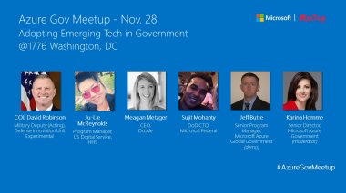 Hear from innovators at the leading edge of emerging tech in government at the next Microsoft Azure Government DC meetup, How Government is Adopting Emerging Tech, on Wednesday, Nov. 28 from 6 – 8:30 p.m. at 1776 in Washington, DC. Join us and gain insight from our speakers who will share how agencies are approaching strategy, challenges, use cases and workforce readiness as they leverage emerging tech to innovate for their mission.